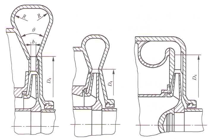 (a)蝸殼前為擴(kuò)壓器 (b)蝸殼前為葉� (c)不�(duì)�(chēng)�(nèi)蝸殼