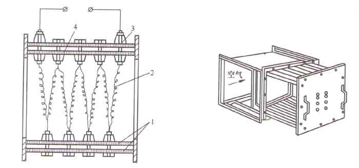 如圖4-6所�,所述裸體導(dǎo)線式電加熱器由呈螺旋狀纏繞的裸電阻線構(gòu)�。電阻線直接暴露在風(fēng)路上,而流�(dòng)在電阻線上的空氣被灼熱的電阻線加�。在定型�(chǎn)品中,使這�(gè)電熱器的安裝、檢查方��