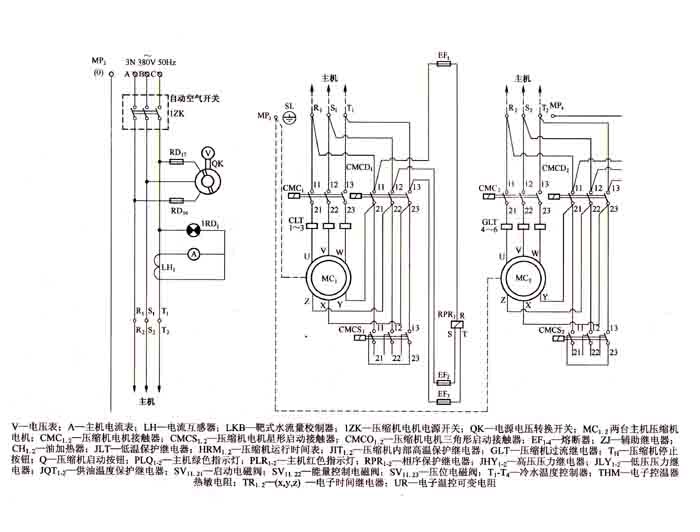 雙螺桿式冷水�(jī)�的電控系�(tǒng) 單元電氣原理圖如�5-30所�� 雙壓縮機(jī)具有紫外線燈,具有高低壓保護(hù),發(fā)�(dòng)�(jī)�(guò)熱保�(hù),高溫保�(hù),溫度和相位低水溫保�(hù),保�(hù)和空氣等安全保障措施。當(dāng)控制這些保護(hù)器觸�(diǎn)�(shí),在一系列保護(hù)器中,如果有任何�(cuò)�,可能會(huì)�(dǎo)致壓縮機(jī)自動(dòng)�(guān)�� 在大型循�(huán),MCI和MC2� - 壓縮�(jī) - 馬達(dá))其中yΔ封閉陣列電壓,低脂主�(kāi)�(guān)1ZK,市電電壓相� - 更改Qk的變�,三�(gè)380V AC功率每�(gè)接收到的R1,S1和t1和R2� S2中,空的MP2端T2�(jié)� - Linie.Von 11�12�13 - 終端備份EFI_3)和三相EF4_6 - 帶和RPR2 R,S和T - - 電源,以保護(hù)在另一�(cè)從RP�(yùn)行其他的端部�(yè)�,訪�(wèn)和RPR2�(yīng)確保壓縮�(jī)的正確方向� �(méi)有被AC 220伏之前的壓縮�(jī)�,與EF4兩�(gè)壓縮�(jī)壓縮�(jī)� - 加熱ch1和Ch.Sie恒溫器是 - 和將箱中的油,在30�50℃的燃料,壓縮機(jī) - 之前被加熱油START� 單元回路冷卻水泵,泵,風(fēng)�(jī),冷水安全。季節(jié)ZJE1,ZJC2� �(dāng)您關(guān)閉設(shè)備時(shí),ZJTI是水�,冷卻水泵和�(fēng)扇安全接觸,即不啟動(dòng)或停��