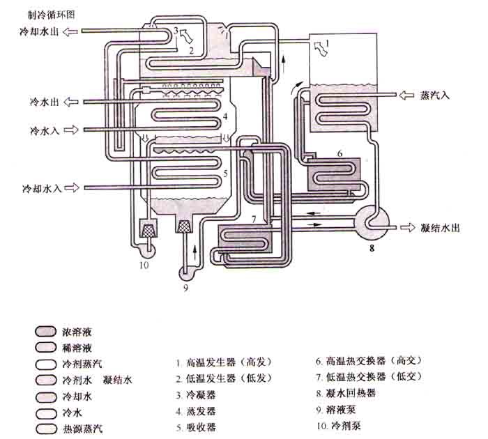吸收劑濃度為64%且溫度�41℃的沸騰填埋液具有非常強(qiáng)的吸收蒸汽容�,并且在吸收蒸發(fā)器的蒸汽之后,溫度升高并且濃度變�。從冷卻塔流到吸收器的熱交換器冷卻水承載從溶液吸收的熱量(即,空�(diào)系統(tǒng)的熱量),但57%的溶液分別被泵送到高溫�(fā)生器和低溫再生器。我�(huì)�(fā)送它。蒸�(fā)器與吸收器位于同一空間,壓力約�6 mm Hg。高溫發(fā)生器(縮�(xiě)為高�(fā))將溶液加熱�165�,產(chǎn)生大量水蒸氣,將水蒸氣置于低溫發(fā)生器�,將57%溶液濃縮至64�,并流入吸收器。高壓約�690 mHg�